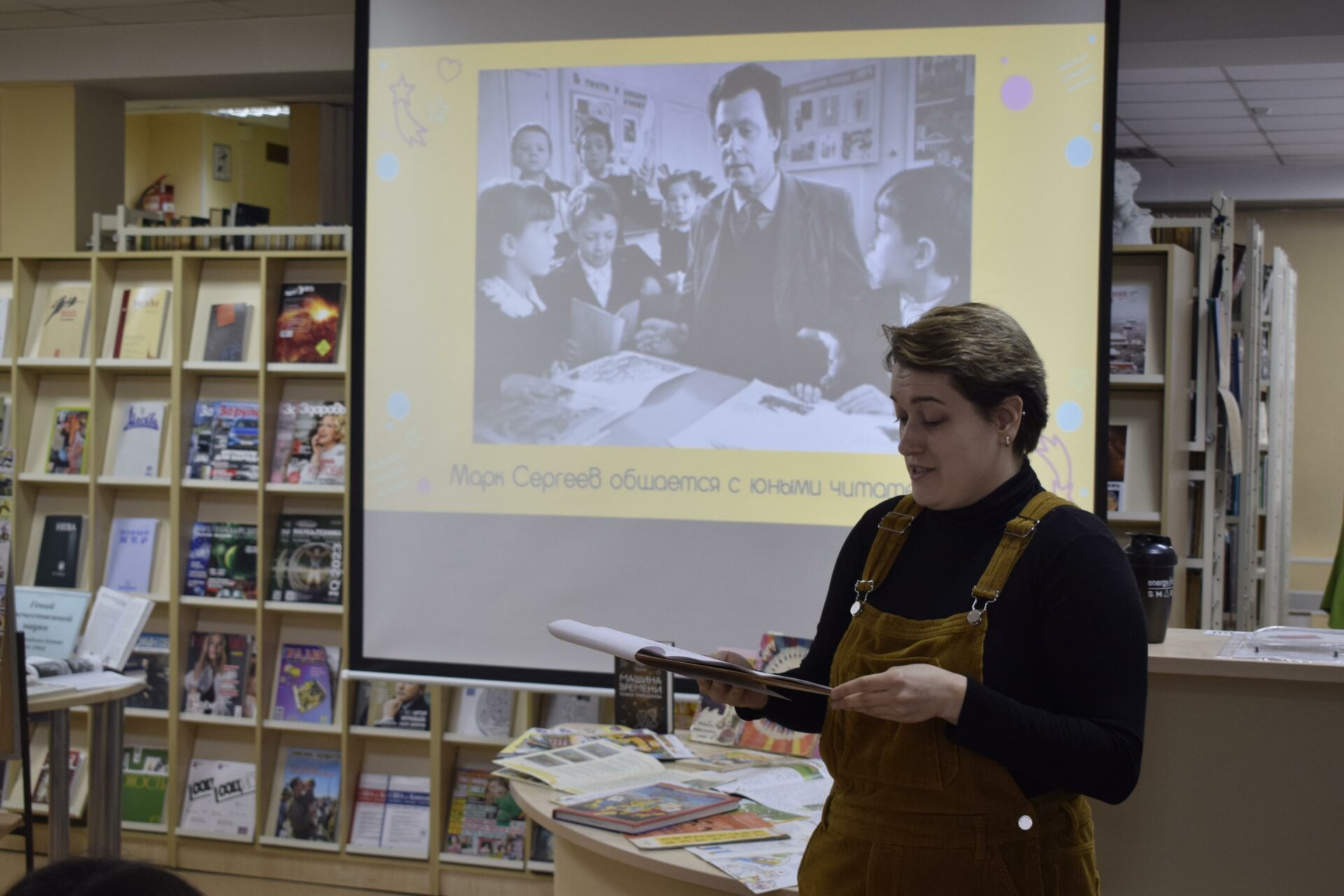 Сотрудники познакомят юных читателей с краткой биографией Марка Сергеева и его творчеством.