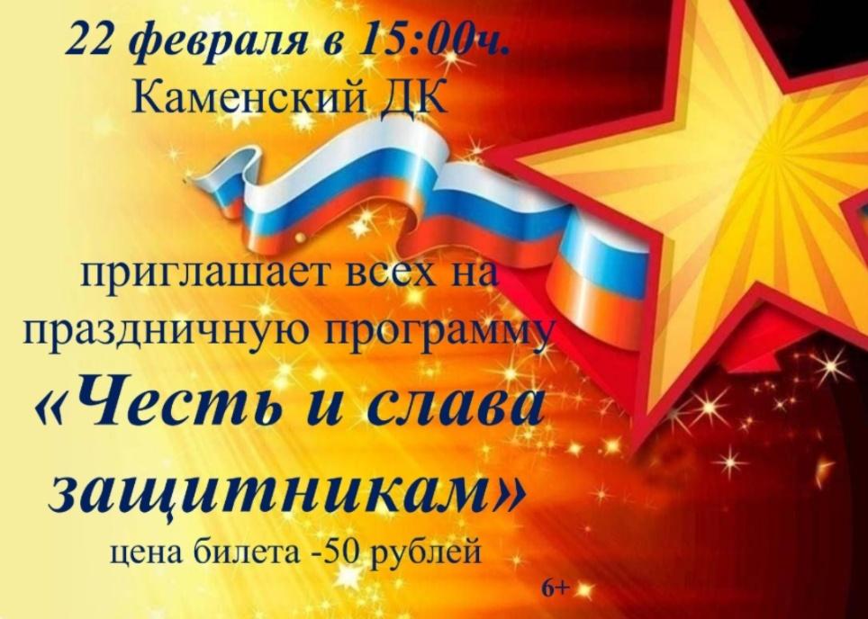 Праздник 23 февраля — хороший повод внести в массы чувство патриотизма, сопричастности к лучшим традициям своей Родины, формирования чувства гордости за славных защитников Отечества. В программу концерта войдут песни и стихи, посвященные мужчинам, в исполнении участников художественной самодеятельности Каменского Дома культуры- Вокальное трио «Гармоника», детская студия эстрадного пения «Звездочки», детская вокальная группа «Акварельки», танцевальный коллектив «Калинка».