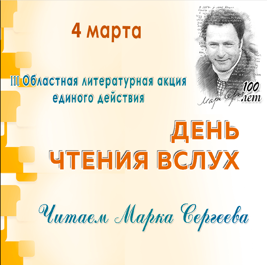 4 марта 2026 года в Межпоселенческой библиотеке им. В.К. Петонова пройдет III Областная литературная акция единого действия «День чтения вслух», посвященная 100-летию со дня рождения иркутского поэта, писателя, поэта, публициста, литературоведа Марка Сергеева.