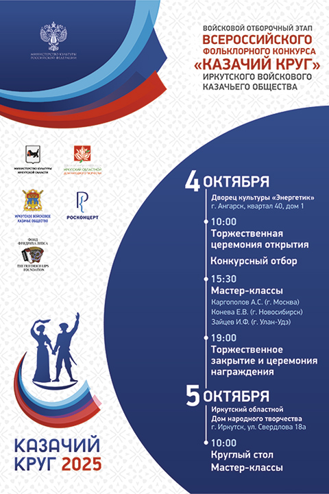 Очный этап войскового отборочного тура Всероссийского фольклорного конкурса состоится 4–5 октября в Ангарске и Иркутске. В программе конкурсные прослушивания, мастер-классы от ведущих специалистов по казачьему фольклору, круглый стол и торжественная церемония награждения участников. По итогам очного этапа жюри определит лауреатов и обладателя Гран-при, который представит Иркутскую область на заключительном гала-концерте в Москве.