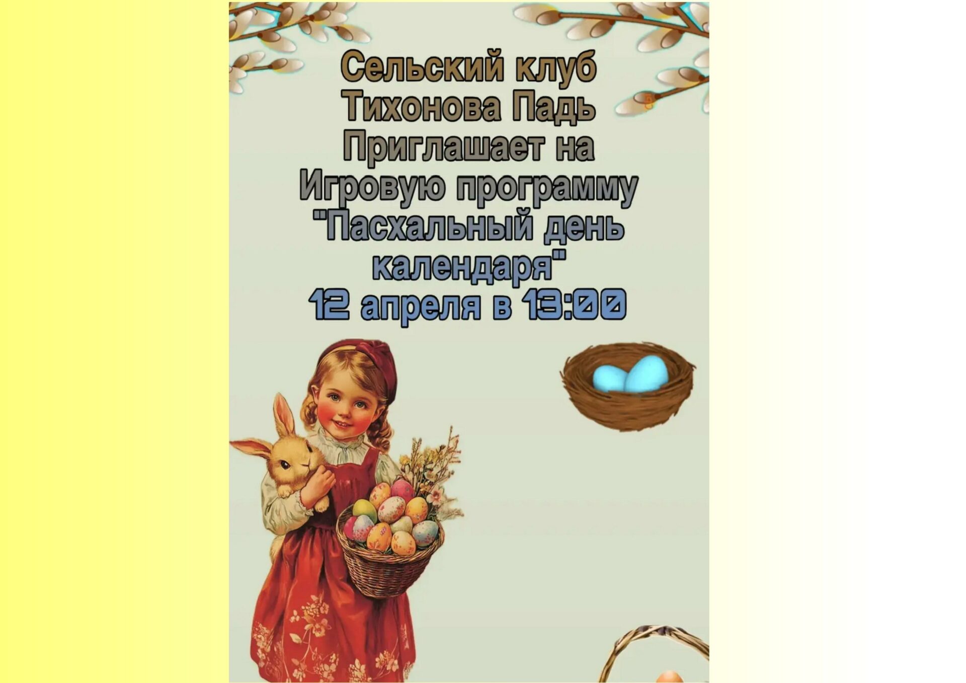 12 апреля в 13:00 в Сельском клубе Тихонова Падь состоится увлекательная игровая программа под открытым небом, посвященная светлому празднику Пасхи. Это мероприятие станет отличной возможностью для жителей деревни и гостей клуба собраться вместе, отпраздновать приход весны и насладиться атмосферой радости и веселья.
