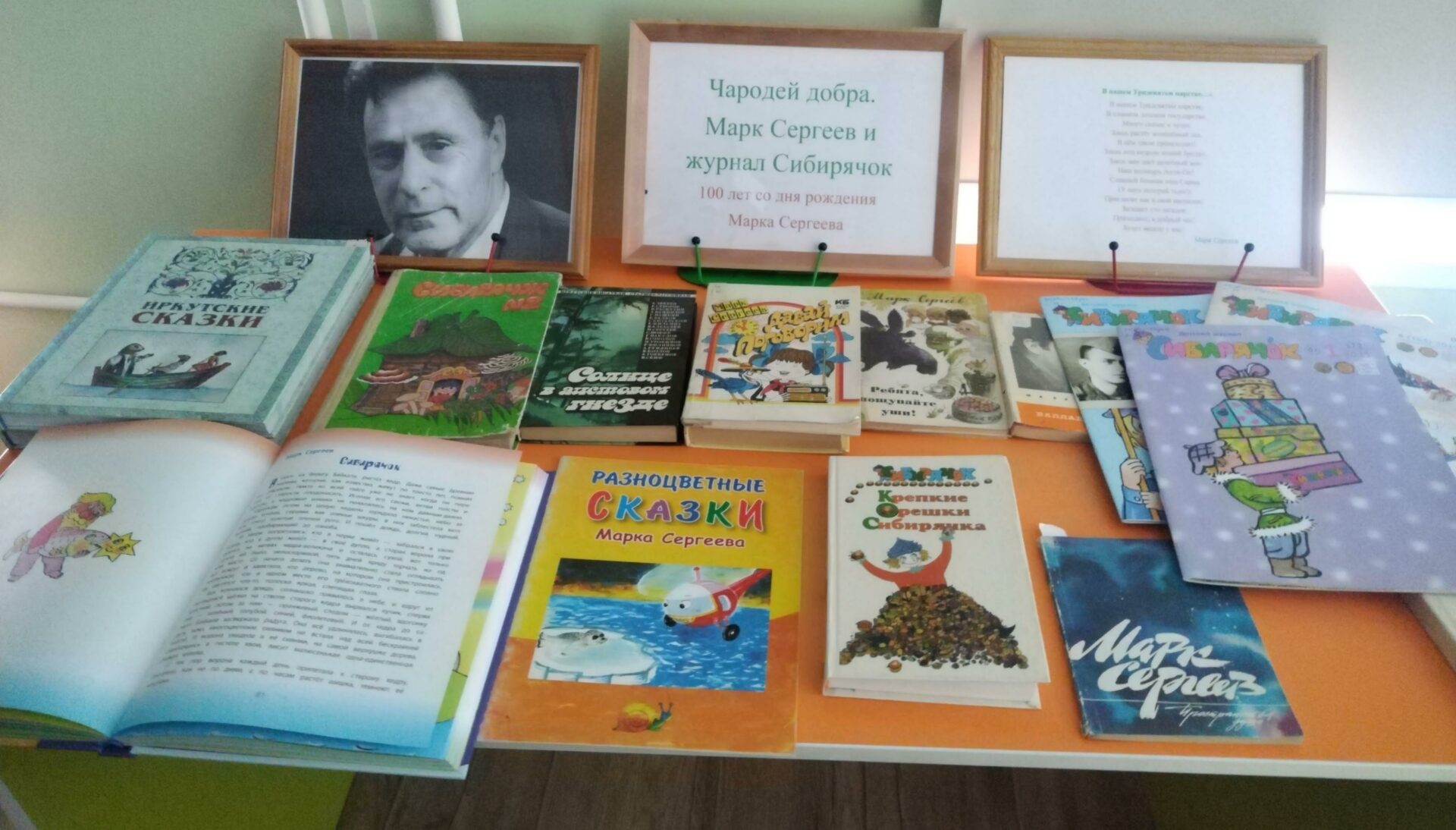 В детском отделе МПБ им. В.К. Петонова оформлена книжная выставка «Чародей добра. Марк Сергеев и журнал Сибирячок», посвященная 100-летию со дня рождения иркутского писателя, поэта, автора детских книг. Марк Сергеев создатель «Сибирячка», именно он придумал главного героя, дал имя ему и журналу, почти все друзья Сибирячка также вышли из его сказок или стихотворений. Его веселые стихи, сказки, познавательные книги-путешествия известны во всех концах страны и за ее пределами. Он писал о тайге,об удивительном мире сибирской природы, который знал не понаслышке.