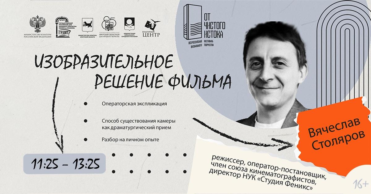 Известный иркутский режиссёр Вячеслав Столяров — оператор-постановщик, член Союза кинематографистов России, директор НУК «Студия Феникс» — в течение двух часов обсудит с собравшимися коллегами изобразительные решения при создании фильма. В поле зрения: операторская экспликация, способ существования камеры как драматургический прием и разбор личного опыта.Кроме очного общения в зале планируется трансляция лекции в прямом эфире на интернет-площадке фестиваля «От чистого истока» и в госпаблике Иркутского областного Дома народного творчества (https://vk.com/iodnt). Фестиваль видеофильмов «От чистого истока» проводится с 2006 года, раз в два года – в Иркутской области. Учредитель проекта Министерство культуры Российской Федерации, организатор – Государственный Российский Дом народного творчества имени В. Д. Поленова. Цель фестиваля – сохранение самобытной национальной культуры, отражение в видеотворчестве истории родного края, судеб уникальных людей – носителей нематериального культурного наследия.