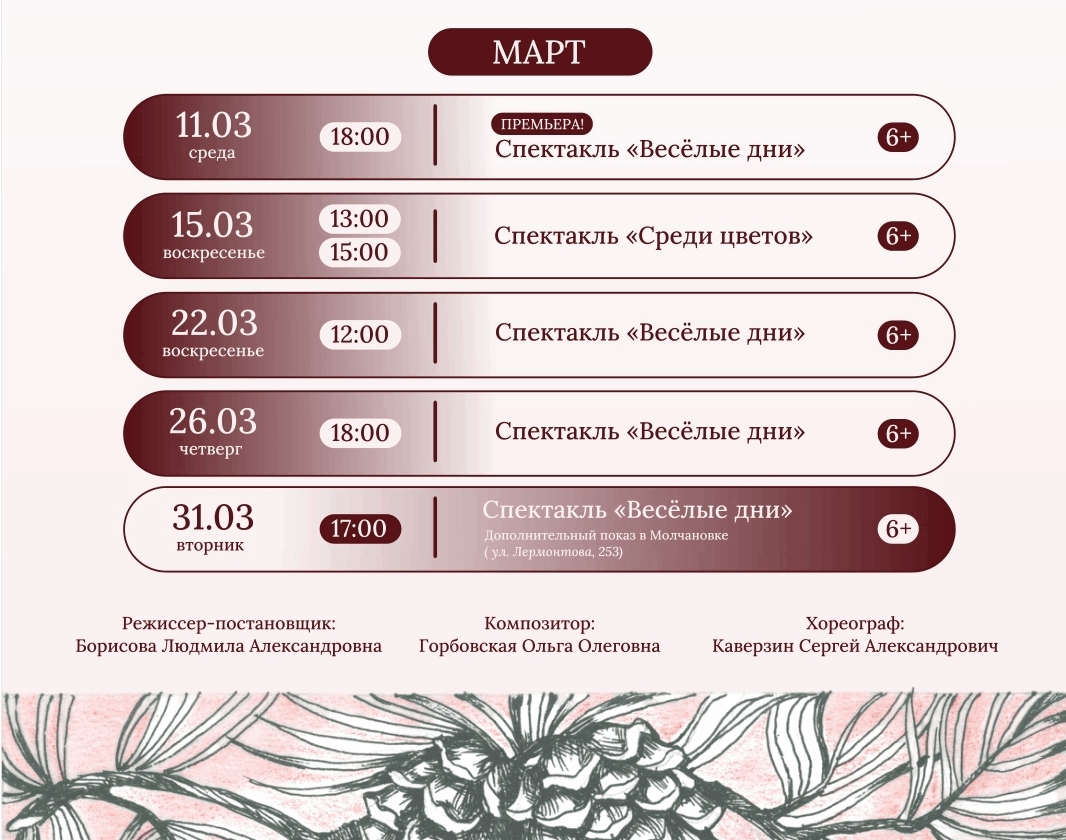 Вас ждут настоящие театральные приключения! Детский театр «Стрекоза» при Иркутском музыкальном театре им. Н. М. Загурского подготовил постановки по пьесам «Веселые дни» и «Среди цветов». Юные артисты оживят на сцене светлые и мудрые произведения Клавдии Лукашевич, действие которых происходит в Иркутске XIX столетия. Вы увидите истории о самом главном: искренней дружбе, милосердии и той неповторимой радости открытий, которую дарит нам детство!