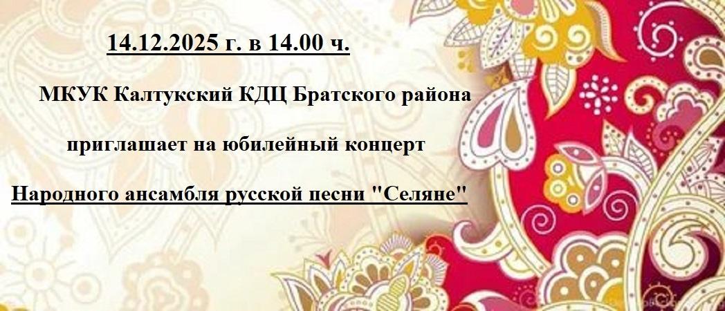В «Калтукском культурно-досуговом центре Братского района», пройдёт яркий, красочный, запоминающийся концерт, посвященный 50-летию образования Народного ансамбля русской песни «Селяне».