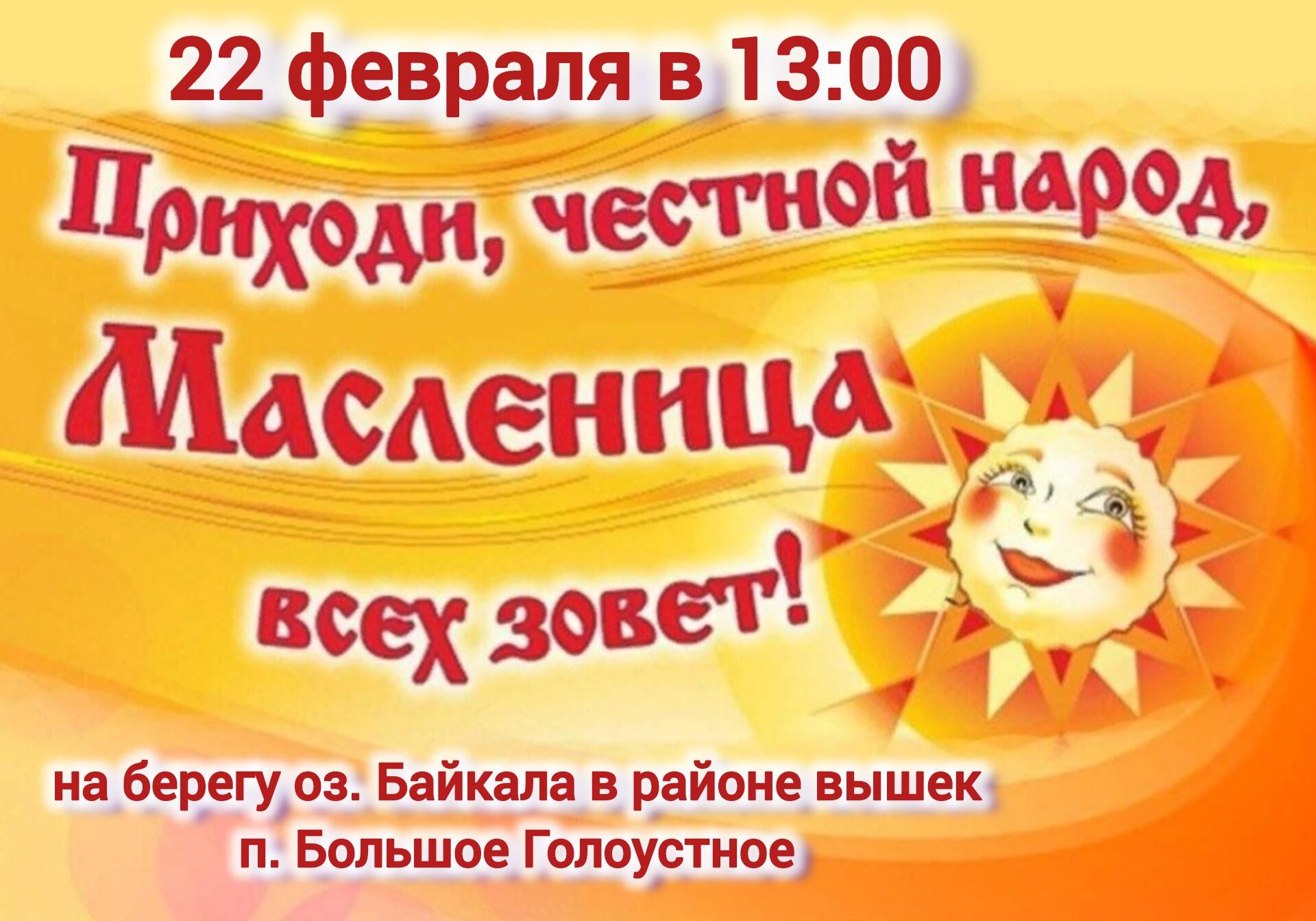 Приглашаем всех жителей и гостей Голоустненского административного округа Зимушку русскую и встретить Весну-Красну 22 февраля в 13:00 в п.Большое Голоустное на берегу оз.Байкала.Вас ждут румяные блины с пылу-жару, спортивные состязания, детские игры и конкурсы, народные забавы и русские потешки.
