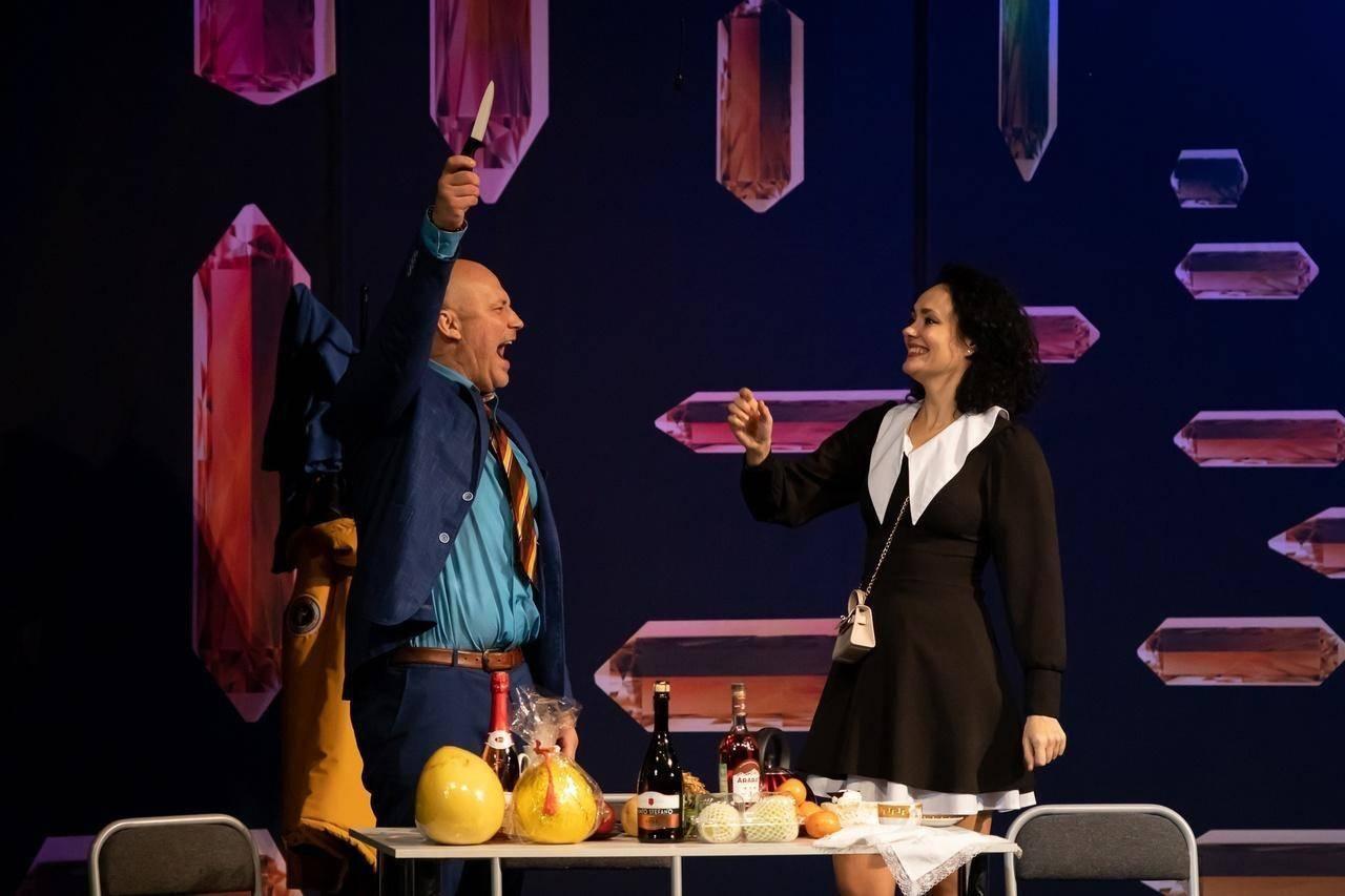 Продолжительность 2 часа без антракта.В ролях: Константин Соловьев, Александр Наумов, Инна Королёва, Ирина Сердечная. Спектакль «Три плюс Кот» поставлен Константином Соловьевом по пьесе Евгения Шестакова.