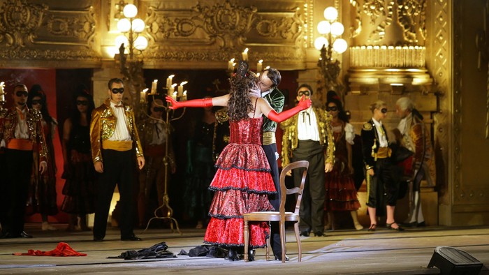 Сила контрастов: хрупкая Виолетта среди каменных громад античного карьера.Декорации на открытом воздухе потрясающие: мы в огромной римской каменоломне; и «Травиата», самое камерное произведение Верди, — пожалуй, первая опера в Санкт-Маргаретен, в которой нет ни лошадей, ни диких животных. Художник Манфред Ваба поместил действие в воссозданную Парижскую оперу. Сперва мы видим фасад огромного здания, но затем створки раздвигаются — и перед нами сцена, ложи и фойе. В ложах — богатые меценаты-покровители, на сцене — танцовщицы и певицы, вокруг — зрители и сочувствующие. Парижская опера трансформируется в особняк Виолетты, в деревенскую виллу и, наконец, становится местом последних минут куртизанки. Софиты сменяются летним солнцем, ему на смену приходит тревожное зыбкое пламя свечей. Вся жизнь этой женщины прошла точно на сцене под взглядами любопытной публики.В заглавной партии — Кристиана Кайзер, привлекательная женщина и хорошая актриса с большим, полным, лирическим голосом. Ее образ прекрасен, она, словно луч света, постепенно меркнет в неумолимо надвигающейся тьме. Альфредо — Жан-Франсуа Боррас с легким нежным голосом, но взрывным характером. Дирижер Эрнст Мерцендорфер играет абсолютно целую версию оперы и поддерживает стремительное развитие драмы, в то же время давая ей возможность дышать.В 2008 году хитом оперного сезона стала живописная постановка «Травиаты» на одном из важнейших европейских оперных фестивалей на открытом воздухе — Санкт-Маргаретен. Этот великолепный спектакль на фоне австрийских гор и романтических руин древнеримской каменоломни записан в июле 2008 года. Художник-постановщик Манфред Ваба поместил трагическую историю демимонденки Виолетты Валери и ее возлюбленного Альфреда Жермона в декорации, воспроизводящие парижскую Оперу Гарнье, с роскошными интерьерами и зрителями в ложах. Ваба и режиссер Роберт Херцль предлагают интеллигентную и эффектную интерпретацию вердиевского шедевра с подающей надежды австрийской сопрано Кристианой Кайзер и молодым французским тенором Жаном-Франсуа Боррасом в главных ролях. Спектакль впечатляет как визуальной, так и музыкальной стороной процесса.