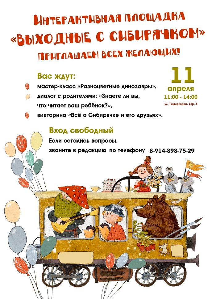 Редакция журнала «Сибирячок» в преддверии юбилея издания приглашает всех на детский праздник. Вас ждут мастер-классы по украшению динозавров, викторина о Сибирячке и его друзьях, а также ярмарка, на которой можно будет приобрести номера журнала.