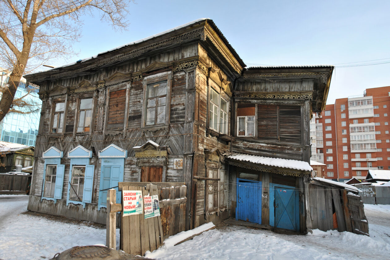— В XIX веке ввели запрет на двухэтажные деревянные здания, поэтому начались все эти «игры» с подклетами и антресолями. Появились разные типы домов с хитрыми полуэтажами. А дальше из этих необычных силуэтов и нестандартных пропорций появлялись интересные фасады. У строителей имелся набор приёмов, но как их скомпоновать — это было делом их фантазии. Особенностью Иркутска являлись «горбатые» дома с крутыми, высокими крышами. Они появились в XVIII веке. Неизвестно, каковы были причины появления такой необычной конструкции. Никакой практической ценности, по-моему, такие скаты не имели. Возможно, это было просто модно. Но откуда пришла такая мода, связано ли это, например, с высокими крутыми крышами некоторых европейских традиционных построек и почему такие дома получили распространение именно в Иркутске, неясно.