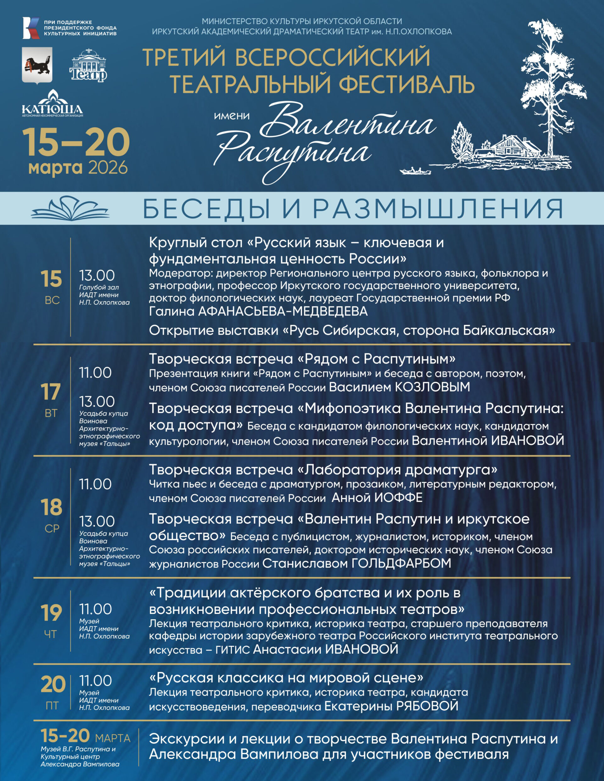 Специальная программа «Беседы и размышления» запланирована в рамках III Всероссийского театрального фестиваля им. В. Распутина, который пройдёт в Иркутске с 15 по 20 марта. Это лекции, экскурсии, встречи с иркутскими писателями, прямая трансляция спектакля, тематические вечера-посиделки с гостями-участниками. Посетить их можно будет бесплатно по предварительной записи.