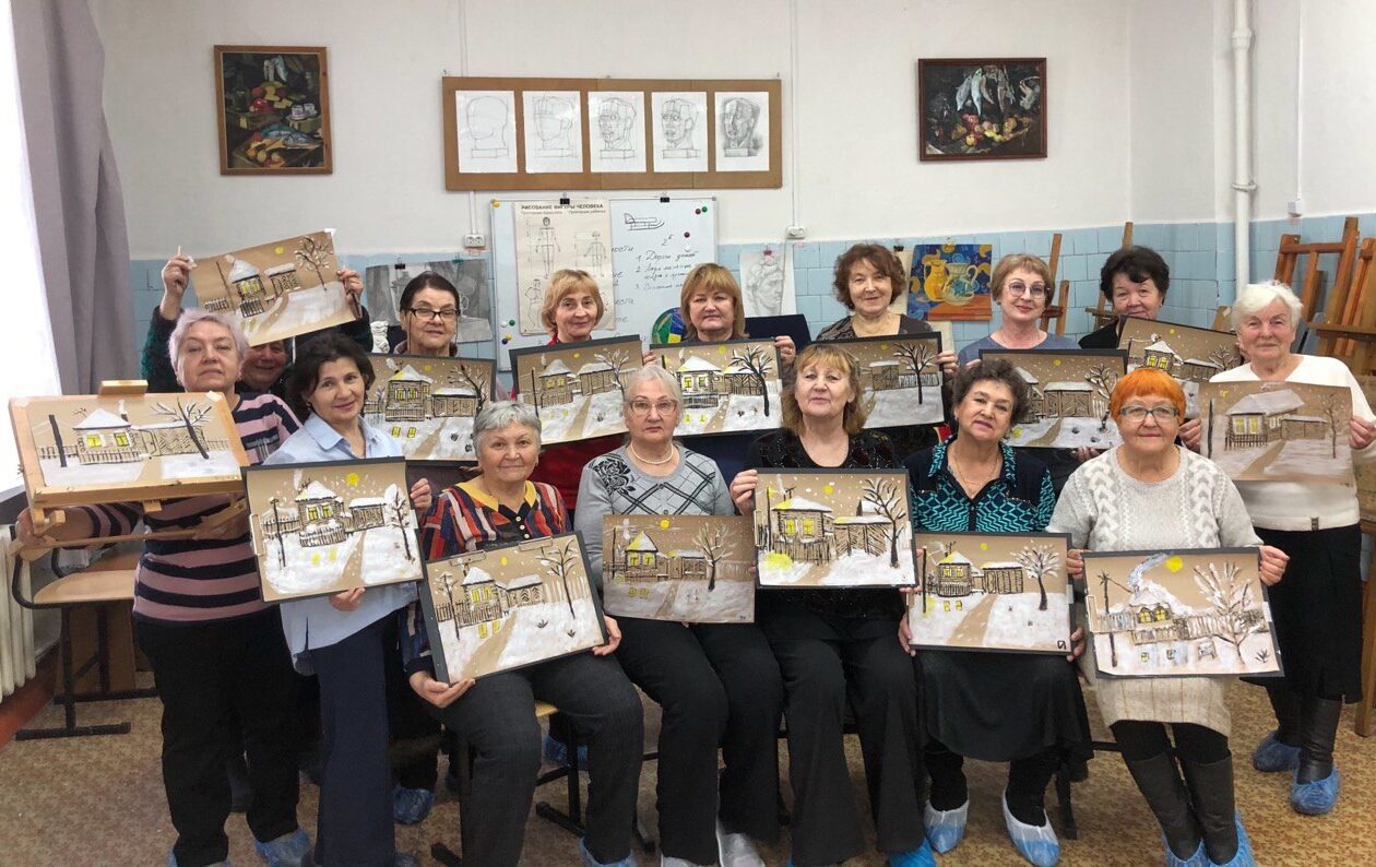 Первое занятие для пожилых людей в рамках проекта «Искусство вне возраста» состоялось 10 декабря 2024 года, оно было посвящено графике. Автор проекта, преподаватель Тамара Кураптева познакомила участников с основами этой техники и поделилась секретами изображения пейзажа. Начинающие художницы создали прекрасные зимние пейзажи с деревенским домиком. Многие вспомнили домики своего детства и постарались изобразить их.