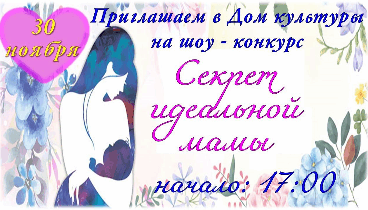 Светлолобовский дом культуры представляет шоу-конкурс «Секрет идеальной мамы», призванный раскрыть таланты, умения и обаяние молодых мам села. Участницам предстоит продемонстрировать свои способности в борьбе за почётное звание «Мисс Идеальная мама». В перерывах между конкурсными испытаниями для гостей и участников выступят творческие коллективы с яркими музыкальными и танцевальными номерами.