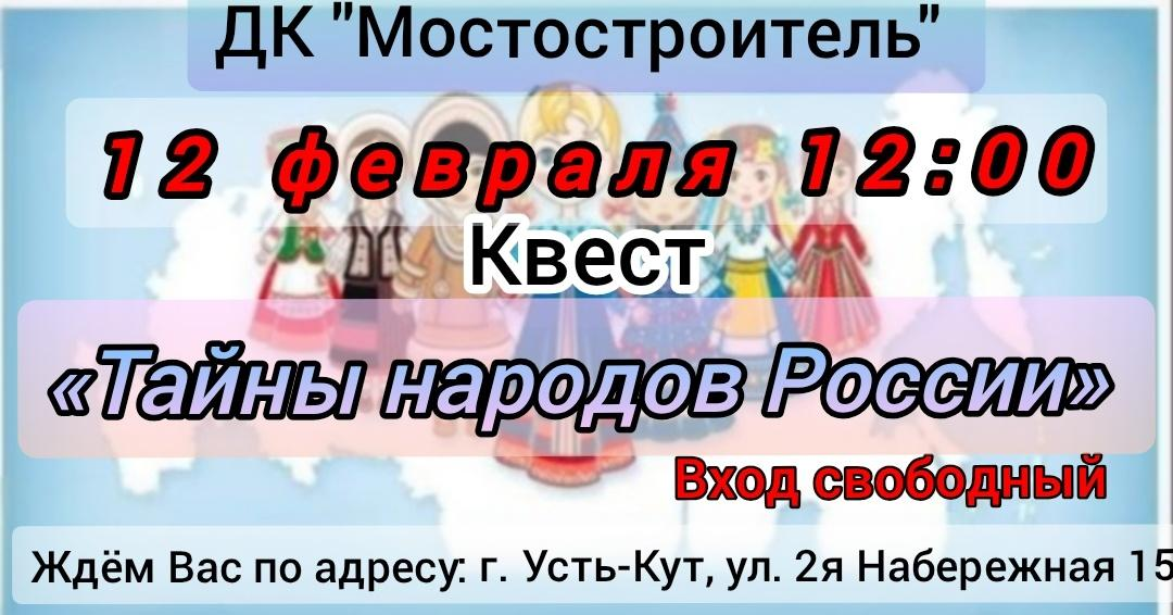 Любознательные жители Усть-Кутского района могут попытаться разгадать тайны народов России. В межпоселенческом доме культуры пройдёт специальный квест, благодаря которому вы сможете отправиться в путешествие по необъятным просторам нашей страны, где каждый этап — это погружение в обычаи, фольклор и историю разных народов. Организаторы подготовили захватывающие испытания, которые потребуют от участников не только эрудиции, но и смекалки, внимательности и слаженной работы в команде. Собирайте друзей и проверьте, насколько хорошо вы знаете культуру России.