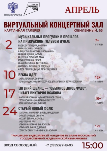В апреле покажут концерт Большого джазового оркестра под управлением Петра Востокова, «Обыкновенное чудо» Евгения Шварца в исполнении Виктории Исаковой с музыкальным сопровождением Российского национального оркестра и концерт «Старый новый фолк».