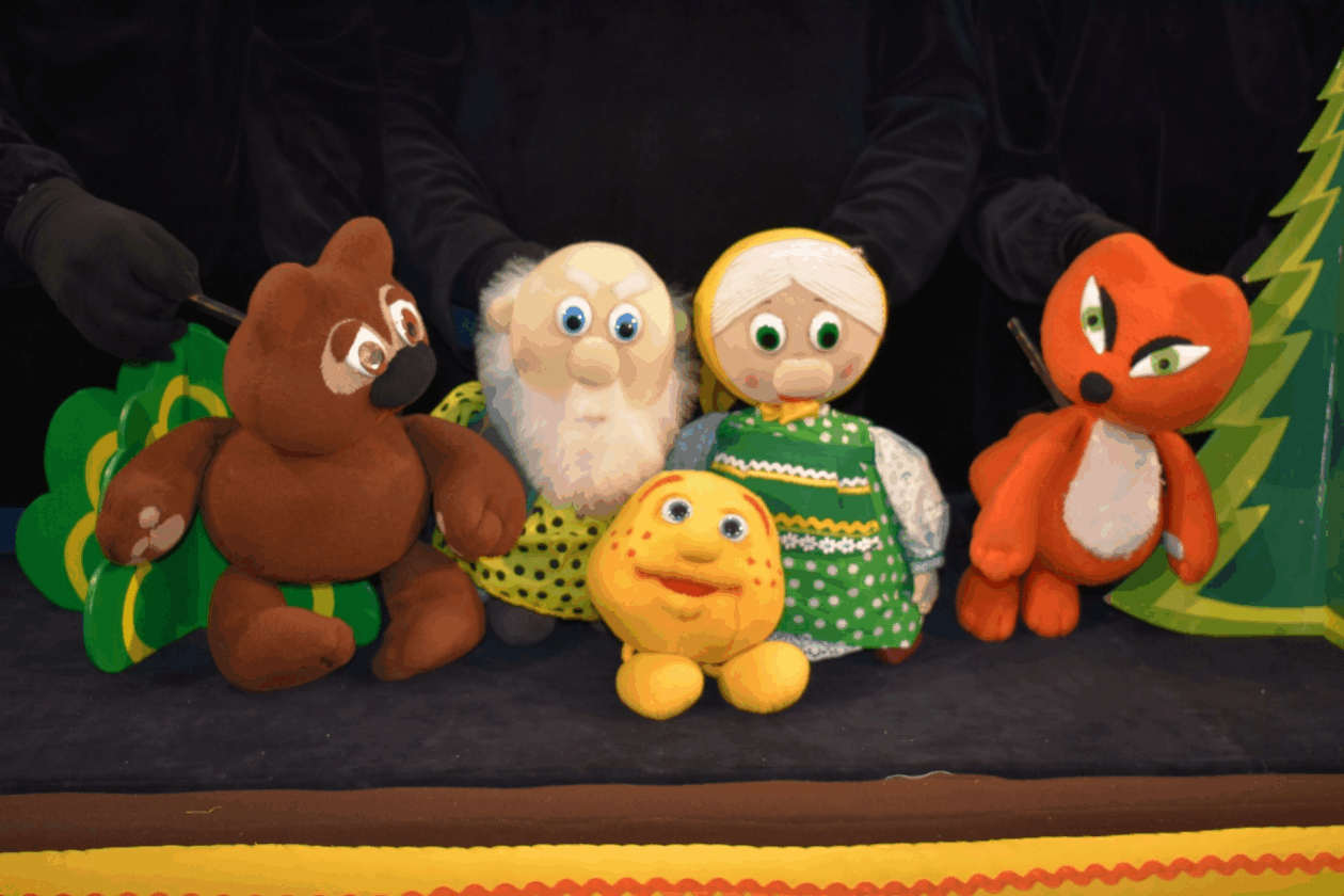 Кто встретится вам на пути и что произойдёт с главным героем, вы узнаете во время сказки. Это интерактивная игра. Дети участвуют в представлении вместе с героями. Каждый раз, когда Колобок встречается с лисой, волком, медведем, ребята начинают танцевать, играть, а герой убегает.