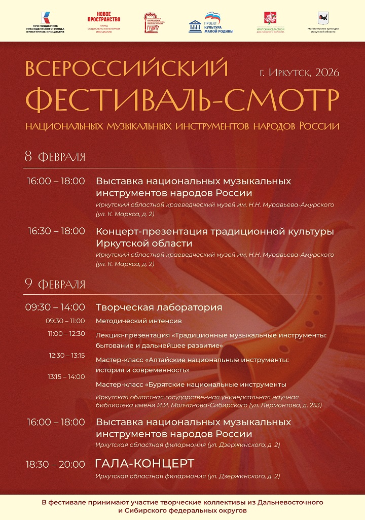 Всероссийский фестиваль-смотр национальных музыкальных инструментов народов России состоится в Иркутске 8 – 9 февраля. Масштабный культурный проект объединяет исполнителей, мастеров, исследователей и зрителей со всей страны. Финальным аккордом мероприятия станет гала-концерт лучших музыкантов-народников Сибирского и Дальневосточного федеральных округов, который пройдёт в Иркутской областной филармонии 9 февраля.