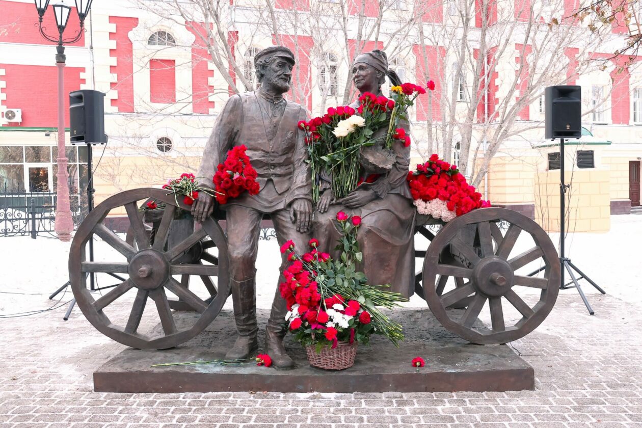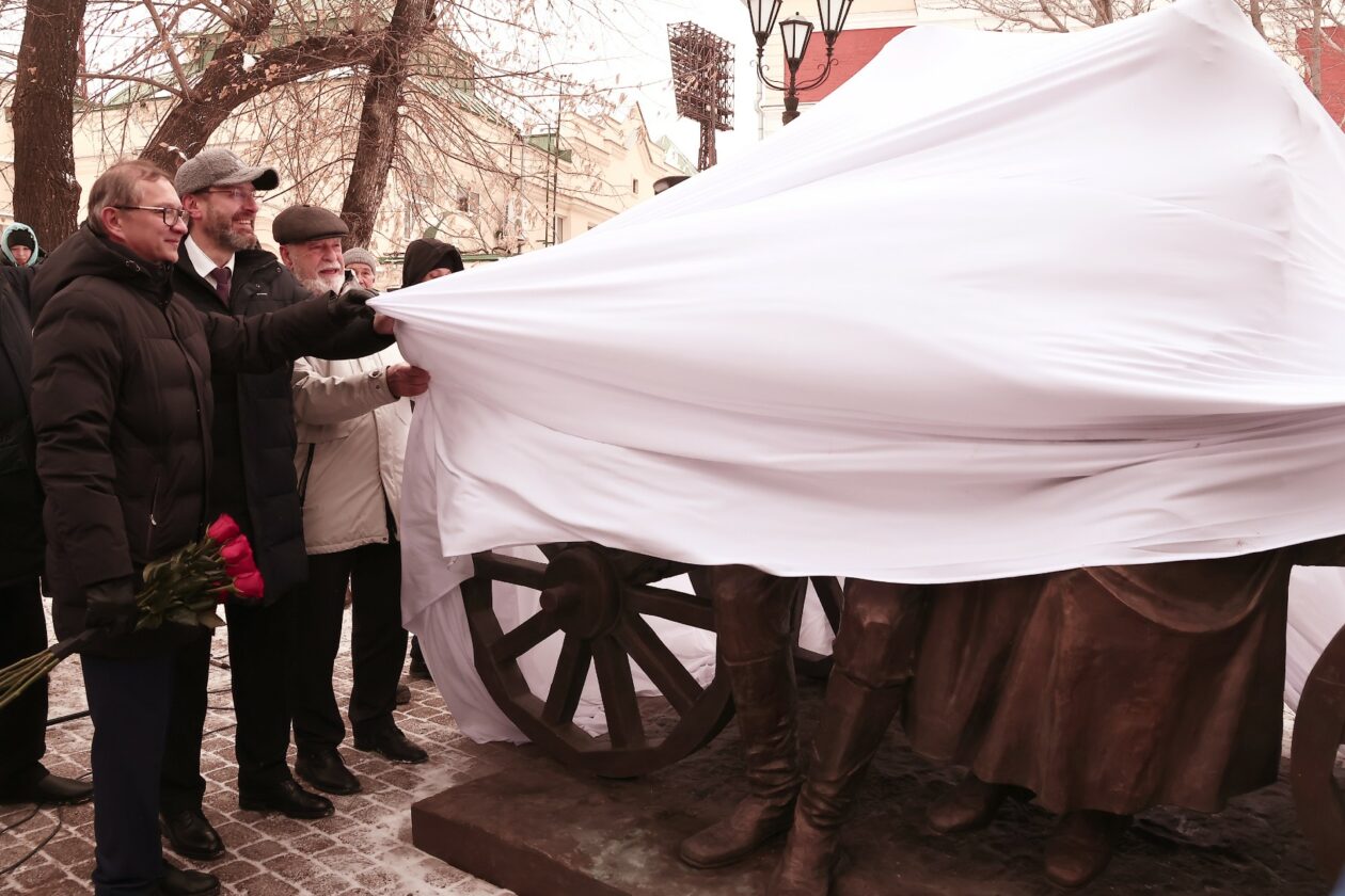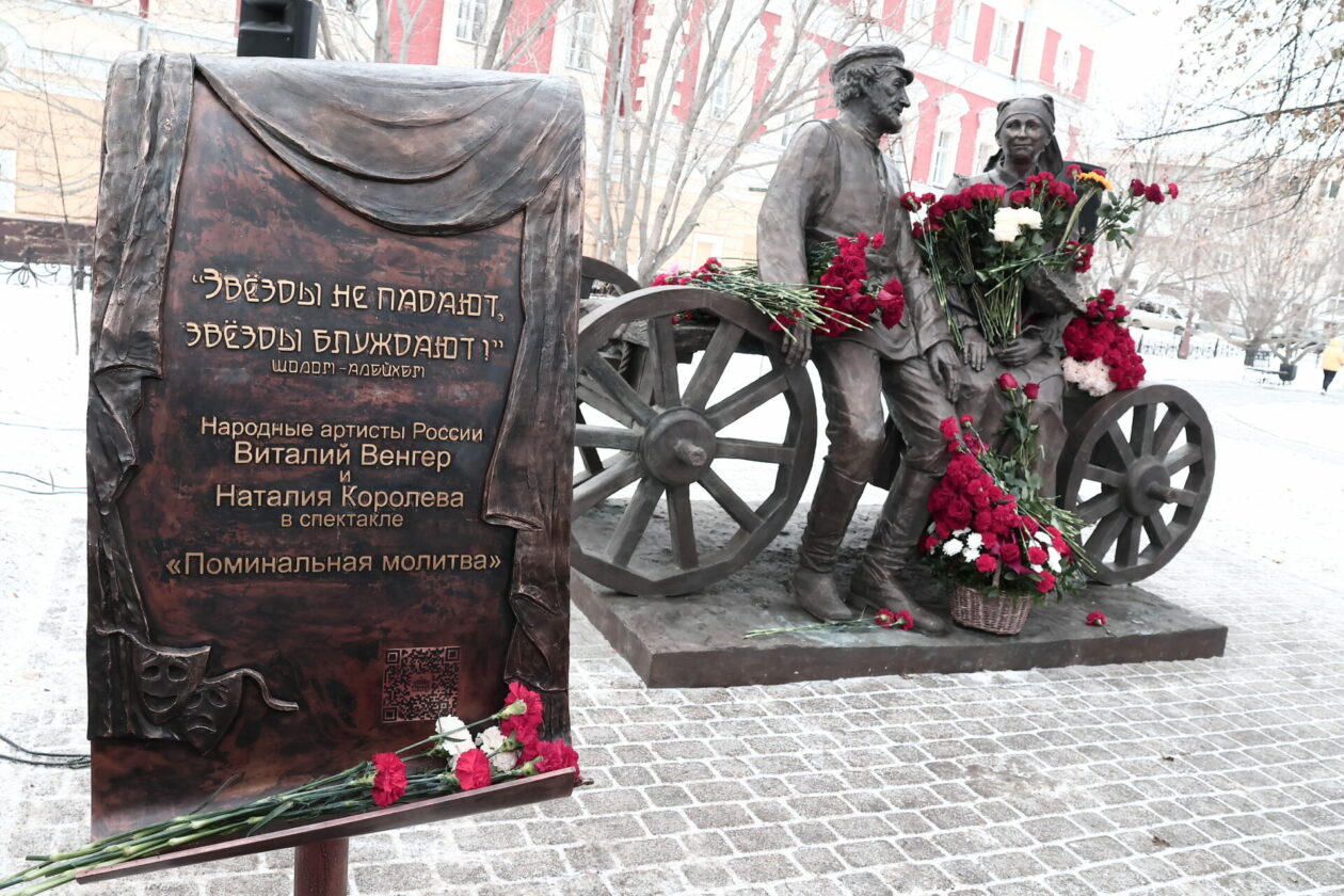 Автором композиции выступила молодой скульптор, член Союза художников РФ Анна Кочегина. Скульптура представляет собой сцену из спектакля «Поминальная молитва» по пьесе Григория Горина. В постановке 1998 года центральные роли исполняли артисты театра, лауреаты премии «Золотая маска» Виталий Константинович Венгер и Наталия Васильевна Королёва. На своей неизменной телеге неунывающий балагур-молочник Тевье сидит с женой Голдой, объединённые общей думой и общей судьбой. Рядом с памятником установлен пюпитр, где есть QR-код, с помощью которого каждый желающий может просмотреть запись постановки.