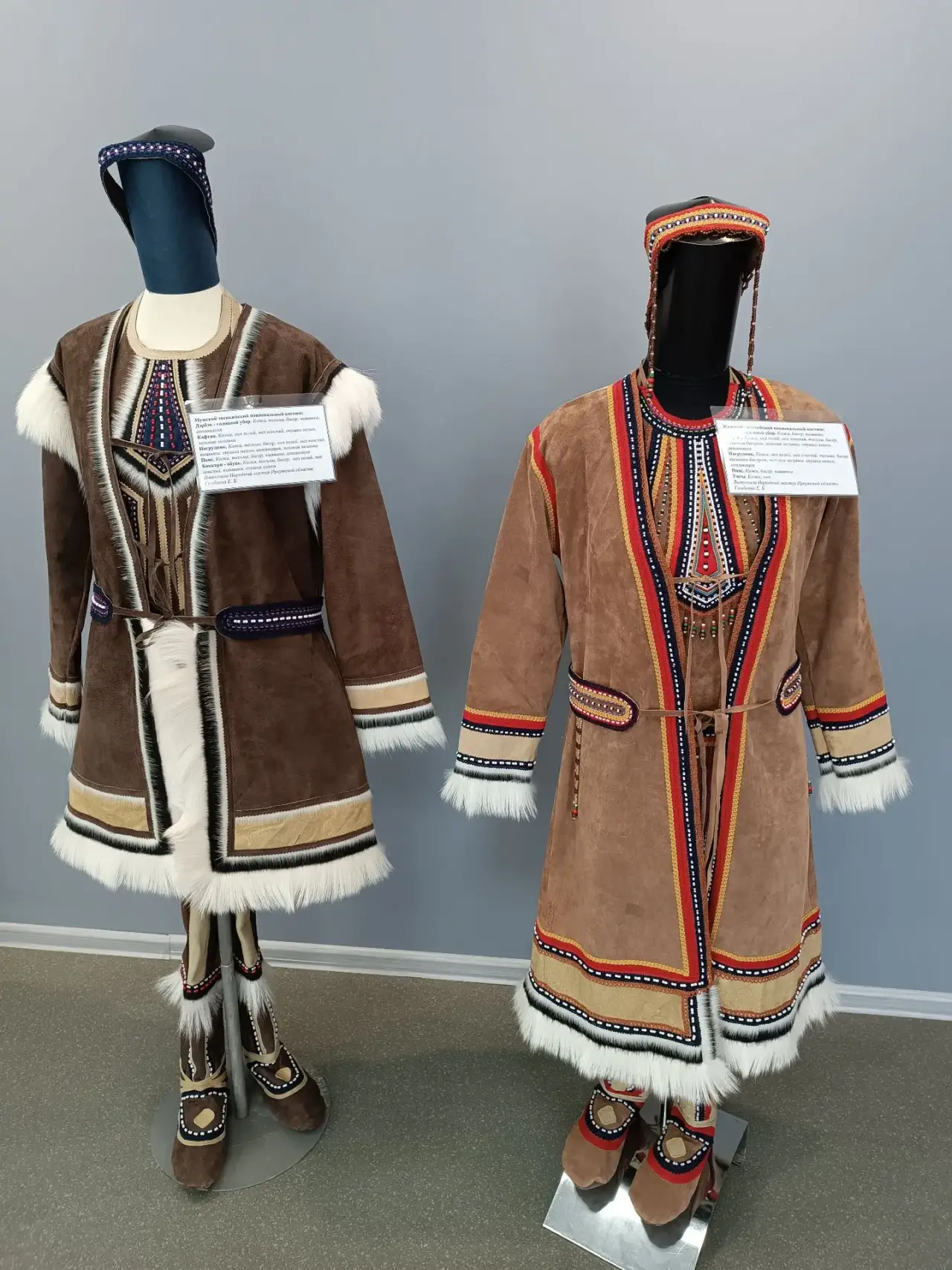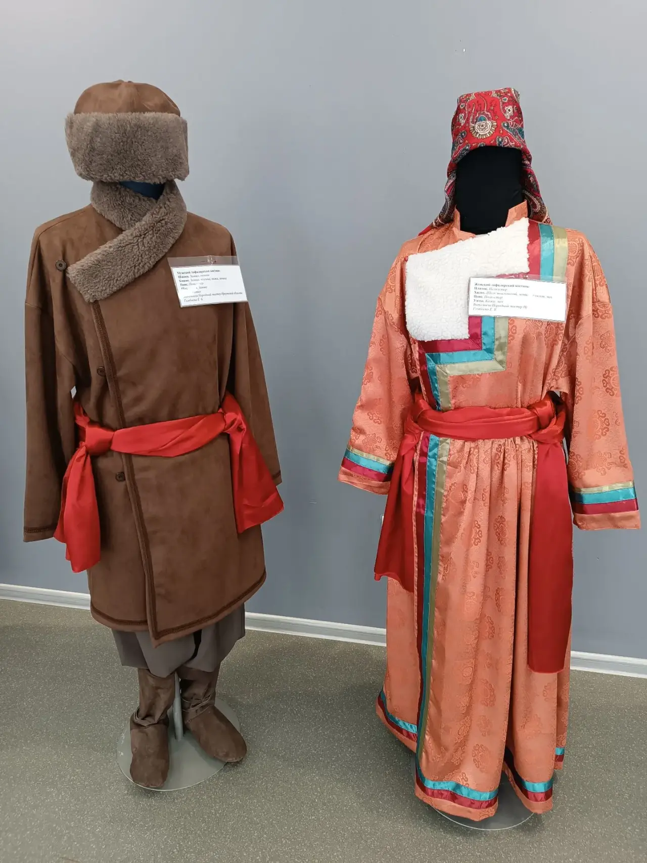 В экспозиции представлены мужской и женский русский и белорусский костюмы, традиционные бурятские костюмы эхиритских и булагатских родов, эвенкийские и тофаларские костюмы и другие.