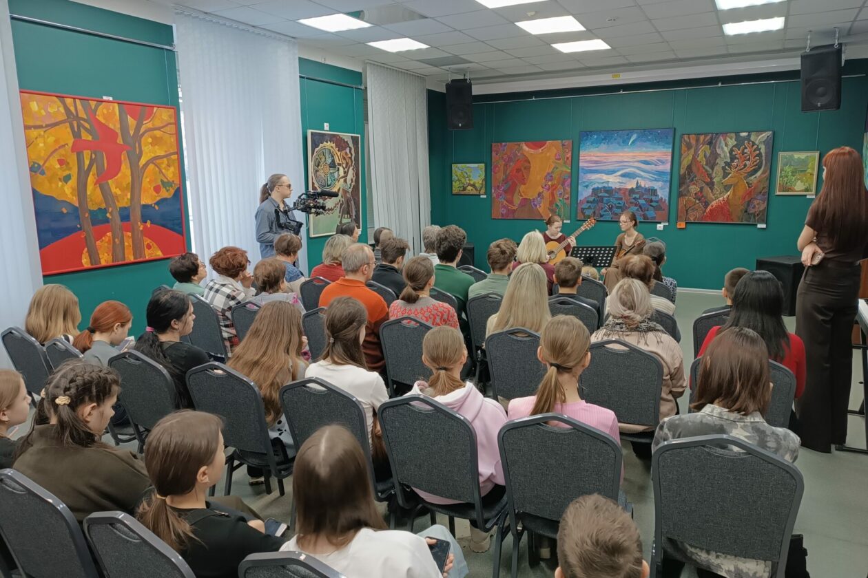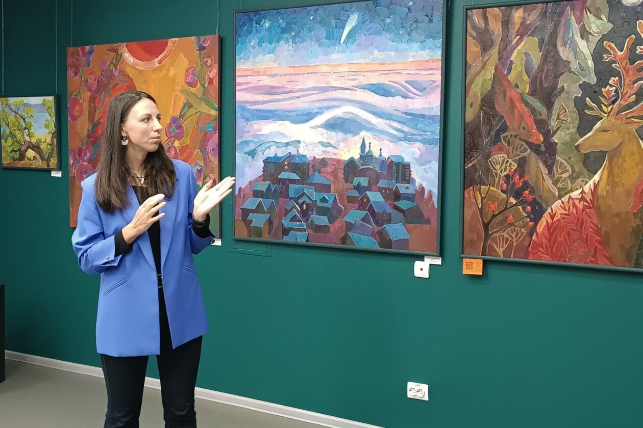 Жители Саянска впервые увидели живопись Анастасии Ижганайтене. Знакомство с пространством творчества автора прошло в формате искренней беседы с художницей. Пообщаться с автором собрались ученики и педагоги Детской школы искусств Саянска, поклонники живописи, школьники, студенты, представители учреждений культуры и городской администрации. Анастасия рассказала о пути в искусстве, процессе создания работ, об источниках вдохновения, одним из которых является музыка. Зная об увлечении художницы вокалом, организаторы открыли вечер музыкальным номером. Ученицы школы искусств исполнили две пьесы. Василиса Колесникова сыграла партию на гитаре, а Ульяна Капустина — на домре.