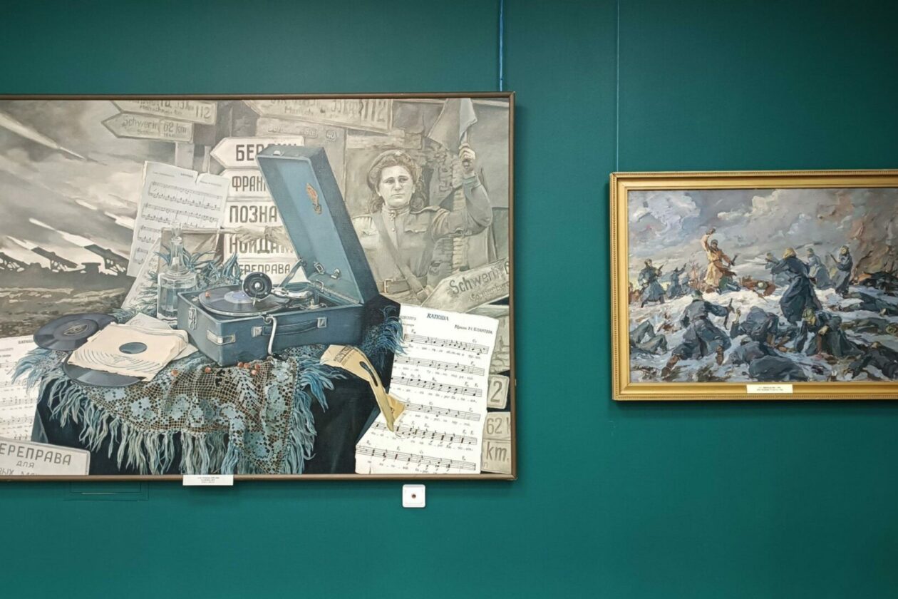В экспозиции представлено более 20 работ-подлинников советских и российских художников, все они посвящены Великой Отечественной войне. Экспозиция объединяет живопись, графику, плакаты, скульптуру и декоративно-прикладное искусство, созданные с 1942 по 2015 год. Каждое произведение наполнено эмоциями и переживаниями людей военного времени. В сюжетах картин отражены самые разные события: сцены боев с гитлеровской Германией, жизнь людей в блокадном Ленинграде, героизм партизан.