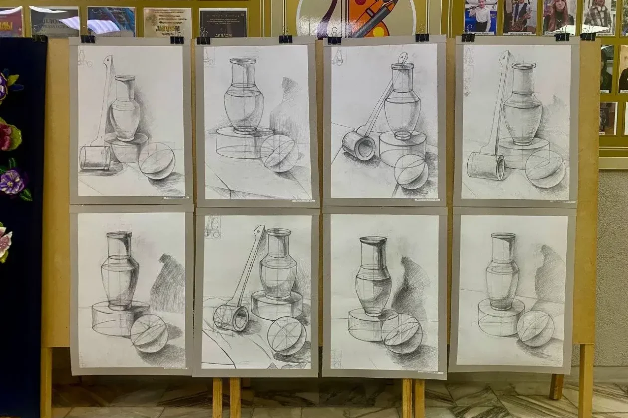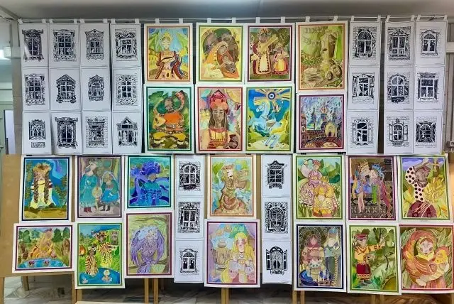 Среди представленных работ — живописный батик на тему «Русские праздники», роспись по стеклу в стиле мезенской, а также экспрессивная линогравюра «Резные окна». В рамках творческой смены дети также освоили основы академического рисунка, на выставке будут продемонстрированы результаты этого обучения.