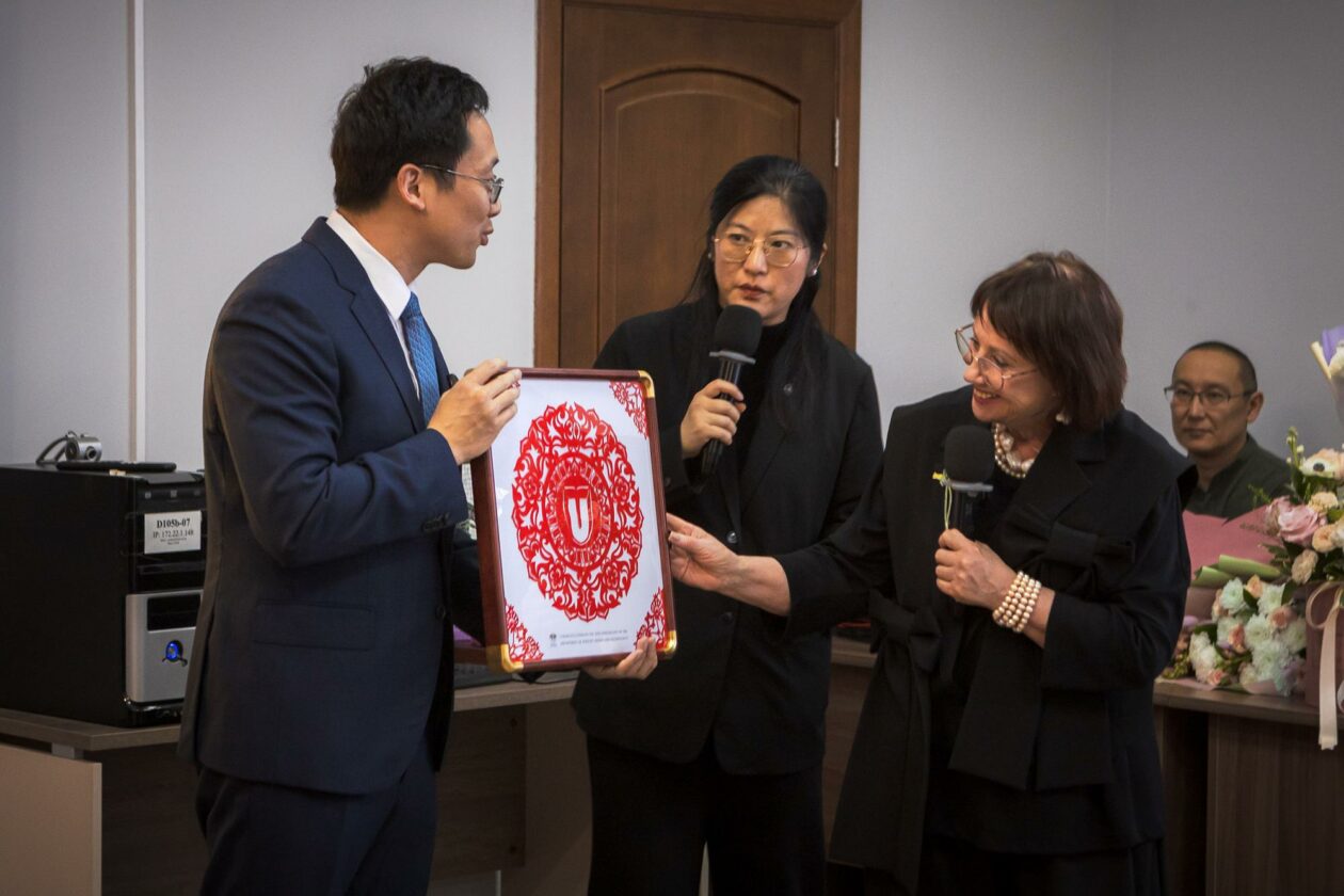 Основатель и заведующая кафедрой, профессор Раиса Лобацкая, принимая поздравления, рассказала, что за 30 лет кафедра выпустила более 600 специалистов. Представитель Геммологического института Ши Кай вручил панно в национальном стиле, украшенное логотипом ИРНИТУ.