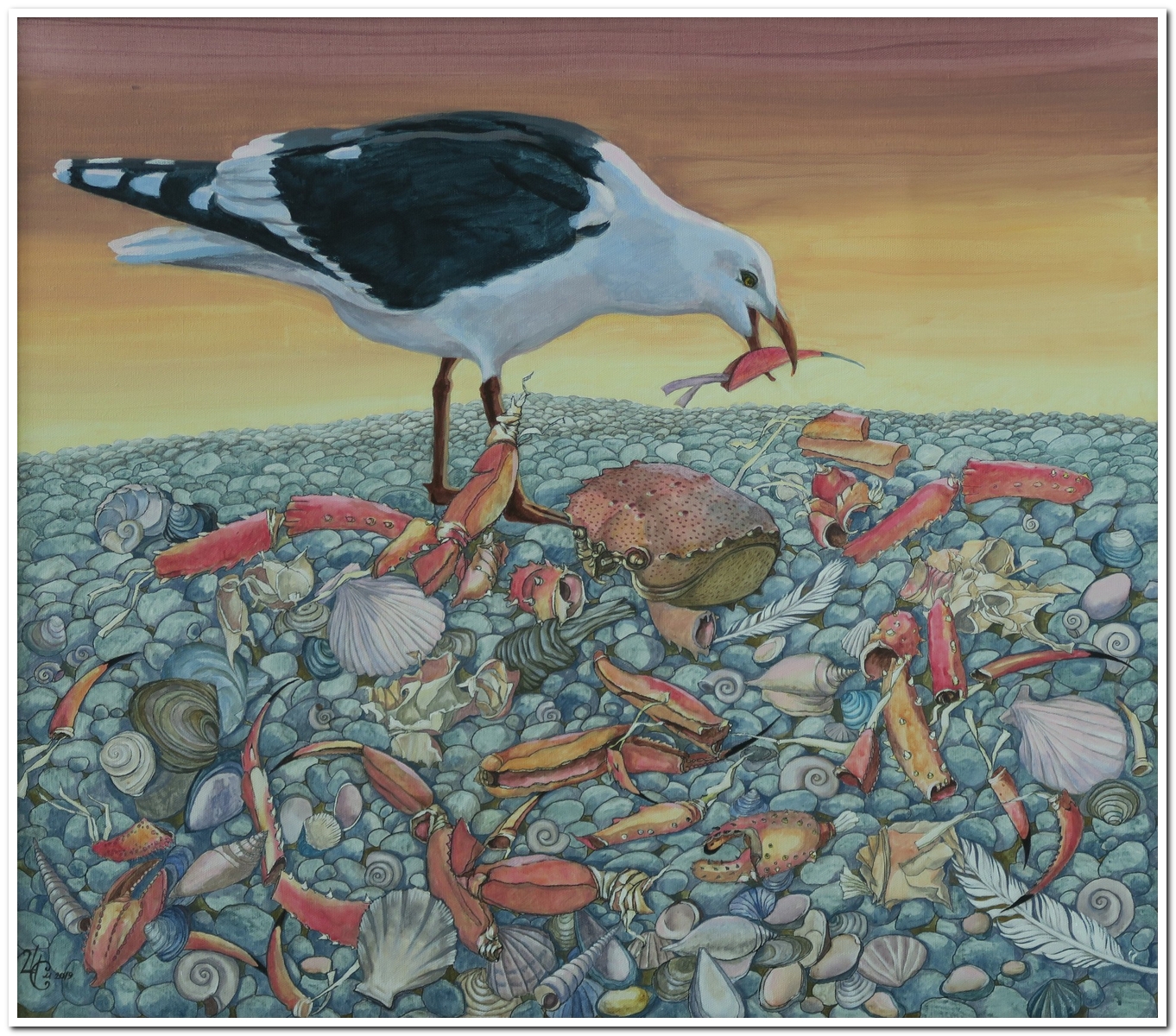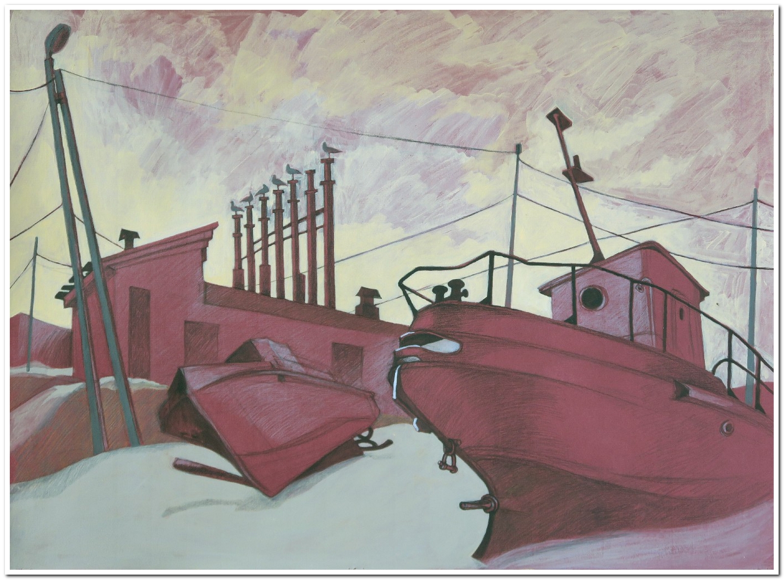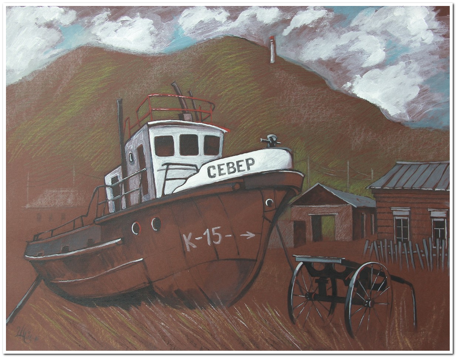Поразилась разрушенному рыбозаводу с торчащими трубами и сидящими на них чайками, ржавым мёртвым кораблям, похожим на китов, выброшенных на берег, деревьям, держащимся за землю из последних сил. Увидела и множество заброшенных домов: внутрь заходишь, а там чашки на столе стоят. Такое ощущение, что хозяева только-только вышли. Усадьбы очень живописные: потрёпанные ветрами, размытые дождём, посеребрённые временем стены. Я понимала, что всё это скоро исчезнет. Через два года ничего уже, и правда, не было: дома снесли и растащили на брёвна, корабли распилили, деревья упали. Это ли не драма? Все эти переживания вылились на бумагу и холст.